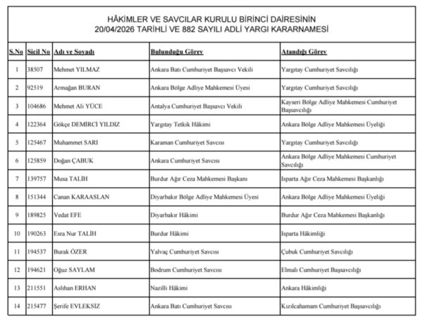Hâkimler ve Savcılar Kurulu Birinci Dairesinin 20.04.2026 tarihli ve 882 Sayılı Adli Yargı Kararnamesi yayımlandı.