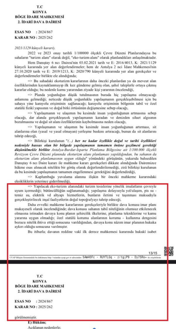 Kaş-Kekova ÖÇK sınırlarında bulunan Limanağzı bölgesi korunan alan statüsünde olduğu için planlama yetkisi Çevre, Şehircilik ve İklim Değişikliği Bakanlığı’nda. Bakanlığın bölge için hazırladığı 25 binlik planlar, 2015 yılından bu yana siyasi isimlerin de aralarında bulunduğu arazi sahiplerine imtiyazlar tanıyarak yapılaşma alanları yarattığı gerekçesiyle dava konusu ediliyor. İlki 2015, devamında ise 2019 yılında hazırlanan planları yargı iptal etmişti. Bakanlığın Kaş-Kekova ÖÇK için 2022’de hazırladığı, 2023 onaylı son 25 binlik plana karşı açılan davadaki yargı süreci ise halen Danıştay’da devam ediyor. Antalya 5. İdare Mahkemesi, plan kararlarında Limanağzı bölgesini de kapsayan alanda eko-turizm amaçlı yapılaşmanın getireceği risklere karşı açılan davayı reddetmişti. Mahkemenin 27 Mart 2024 tarihli kararına itiraz eden davacıları haklı bulan Konya Bölge İdare Mahkemesi, 19 Şubat 2025 tarihli kararında alt derece mahkemenin kararını bozmuştu. Mahkemenin bozma kararında, daha önceki iptal kararlarına da atıf yapılarak dava konusu planın şehircilik ilkelerine, planlama tekniklerine ve kamu yararına uygun olmadığı; özel statülü koruma alanlarının koruma-kullanma dengesini bozucu nitelik içerdiğinin de altı çizildi.