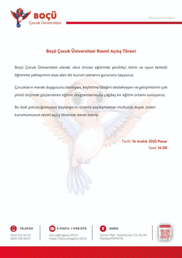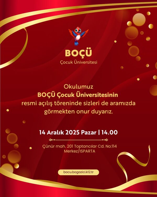 Okul yönetiminden yapılan açıklamada; “Boçü Çocuk Üniversitesi olarak, okul öncesi eğitimde yenilikçi, bilim ve oyun temelli öğrenme yaklaşımını esas alan bir kurum olmanın gururunu taşıyoruz. Çocukların merak duygusunu besleyen, keşfetme isteğini destekleyen ve gelişimlerini çok yönlü biçimde güçlendiren eğitim programlarımızla çağdaş bir eğitim ortamı sunuyoruz. Bu özel yolculuğumuzun başlangıcını sizlerle paylaşmaktan mutluluk duyar, sizleri kurumumuzun resmî açılış törenine davet ederiz” denildi.