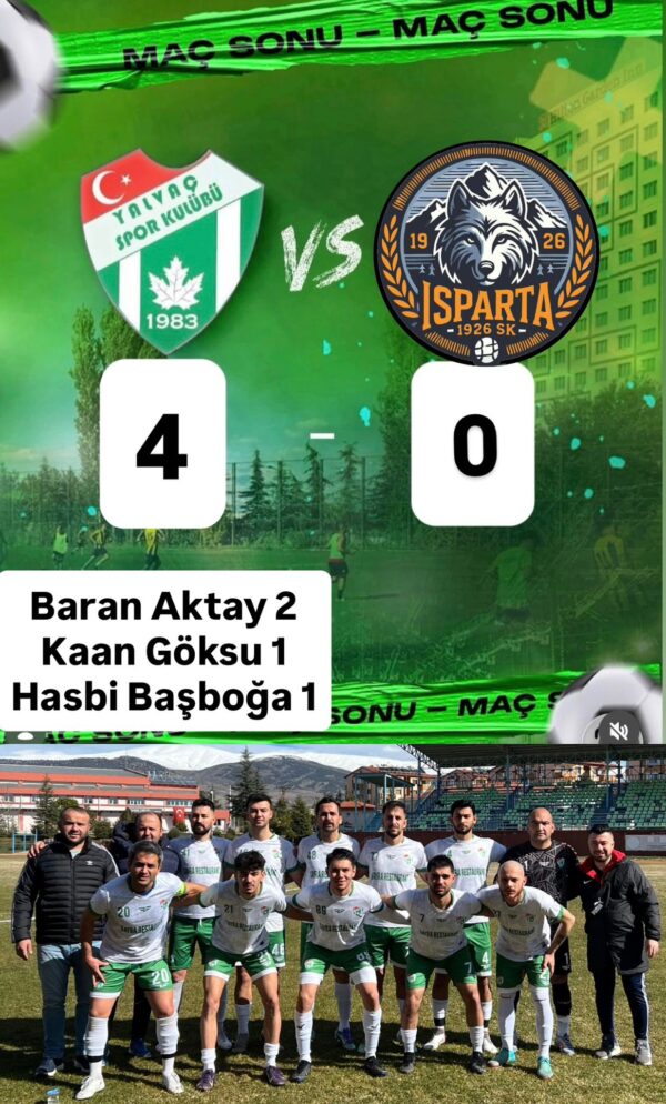 İlk yarısı golsüz biten maçın ikinci yarısında Baran Aktay’ın iki, Kaan Göksu ve Hasbi Başboğa’nın birer golüyle BAL ligine yükselme yolundaki önemli rakiplerinden birini 4-0 geçen Yalvaçspor’da moraller oldukça yükseldi.