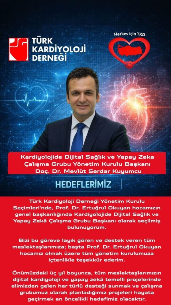 “Türk Kardiyoloji Derneği Yönetim Kurulu Seçimleri’nde, Prof. Dr. Ertuğrul Okuyan hocamızın genel başkanlığında Kardiyolojide Dijital Sağlık ve Yapay Zekâ Çalışma Grubu Başkanı olarak seçilmiş bulunuyorum.