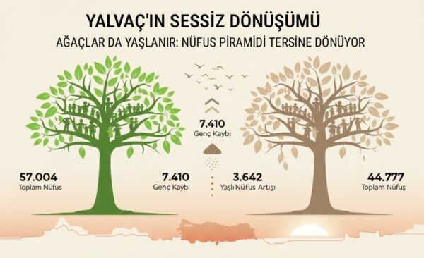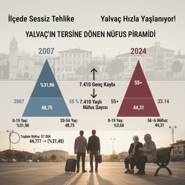 Rakamlara baktığımızda tablo daha da netleşiyor. 0-34 yaş grubunda son 18 yılda yaşanan yüzde 40’ı aşan düşüş, genç nüfusun hızla ilçeden uzaklaştığını gösteriyor. Buna karşılık 55 yaş üstü nüfusun yaklaşık yüzde 35 oranında artması, Yalvaç’ın geleceğine dair önemli bir uyarı niteliğinde. Bu durum yalnızca demografi meselesi değil; ekonomi, sosyal yaşam ve kültürel düzen için de büyük bir dönemeç anlamına geliyor. Genç nüfusun ağırlığını kaybeden bir ilçenin iş gücü azalır, eğitim sistemi zayıflar, sosyal hayat yavaşlar ve yeni yatırımlar için cazibe noktası olmaktan çıkar.