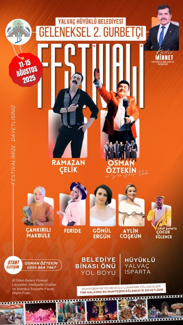 Hüyüklü Belediye Başkanı Kadir Minnet, beldelerinin bölgenin en çok gurbetçisine sahip yerleşim yeri olduğunu belirterek, “Gurbetteki Hüyüklülülerimizin sılaya döndükleri bu tarihlerde onları eğlendirecek, bölge halkımızın Hüyüklü’de buluşmasını sağlayacak, ekonomik ve kültürel hareketlilik sağlayacak 2. Gurbetçi Festivalimizi bugün başlatıyoruz. Gündüzleri alışveriş standlarından faydalanacak hemşehrilerimiz, akşamları da konserler ve eğlence etkinlikleriyle buluşacak. Tüm hemşehrilerimi, Yalvaç merkez ve köyleriyle bölgedeki ilçe, kasaba ve köylerdeki vatandaşlarımızı Hüyüklü’ye davet ediyorum.” dedi.