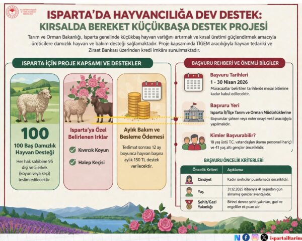 Başvuruların 1–30 Nisan tarihleri arasında alınacağı, müracaatların İl ve İlçe Tarım ve Orman Müdürlükleri üzerinden yapılacağı açıklandı. Değerlendirme sürecinin ardından yılın ikinci yarısında hayvan dağıtımına başlanması planlanıyor.