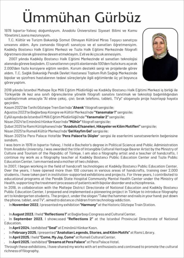 Yaşamını İstanbul’da sürdüren hemşehrimiz, Kültür ve Turizm Bakanlığı Filografi Sanatçısı ve Öğretmen Ümmühan Gürbüz ve öğrencilerinin eserlerinin sunulacağı serginin açılışı 7 Nisan 2026 Salı günü saat 14.00’te Tarık Zafer Tunaya Kültür Merkezi’nde gerçekleştirilecek.