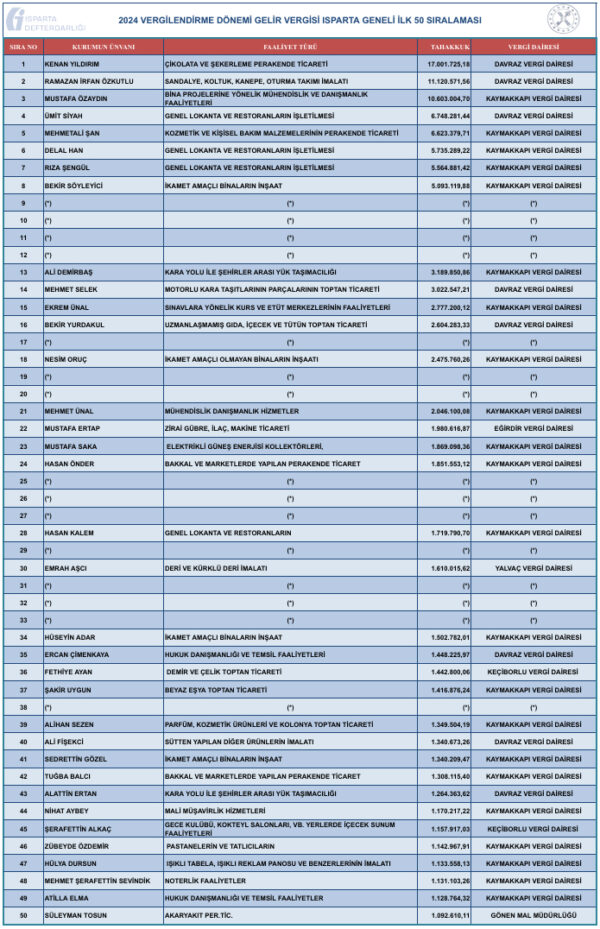 İşte Isparta Defterdarlığı’nın açıkladığı ilk 50 mükellefin ismi şöyle: